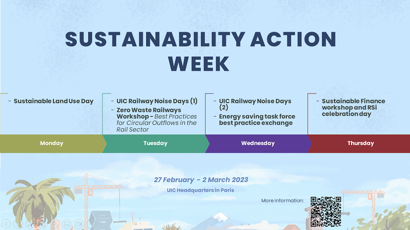 The UIC Sustainability Platform will be holding the 2023 ‘Sustainability Action Week’ in Paris, between 27 February and 2 March 2023. Register now for your free place!