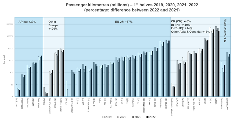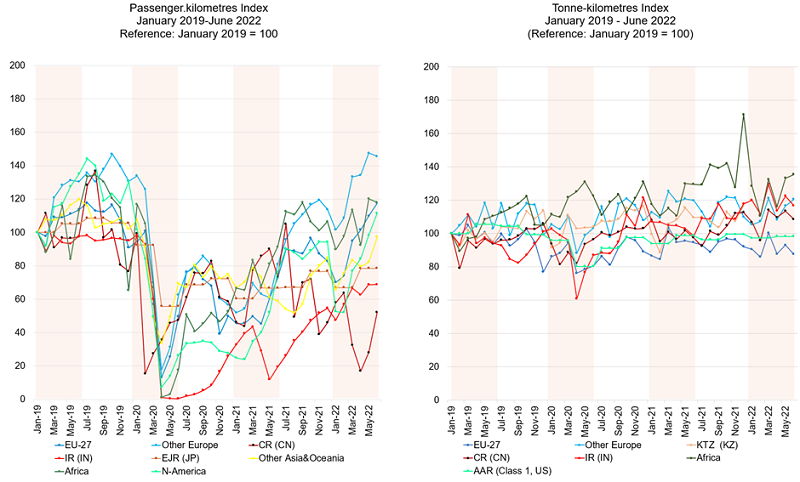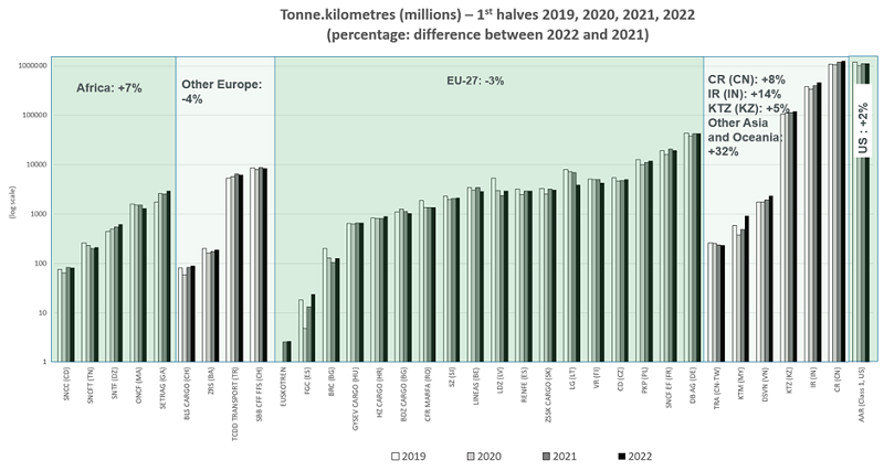 After freight transport was negatively affected during the first half of 2020 due to the pandemic, overall volumes of transported goods then increased to exceed pre-COVID levels in the first half 2022, principally due to a significant growth in tonne-kilometres recorded by rail operators in Asia and, to a lesser extent, in Africa. This trend records, for example, +14 % for IR (IN) in the first half of 2022 compared to the first half of 2021, +13% for KTZ (KZ), +8% for CR (CN) and +22% for DSVN (VN), and for African companies, +18 % for SETRAG (GA) and +13% for SNTF (DZ). However, this trend varied strongly depending on region, as while the pandemic did not impinge too much on freight traffic for these companies, most rail operators in the US and in Europe showed a weak recovery and the volume of transported goods still remained below those of the pre-COVID period. Some operators, TCDD (TR), SBB (CH) and BLS (CH), buck this trend as data showed that their freight traffic volumes were maintained over the entire period and demonstrated good results for the first half 2022.