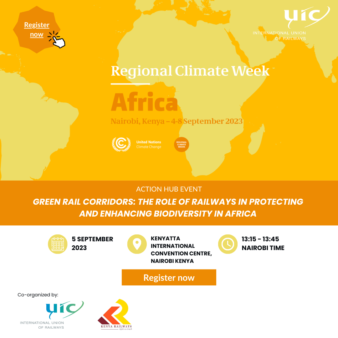 In addition to the main track events, a series of side events and action hub events will showcase and discuss the state of climate change mitigation and adaptation in Africa. As part of the activities UIC will host two events organised jointly with Kenya Railways Corporation: