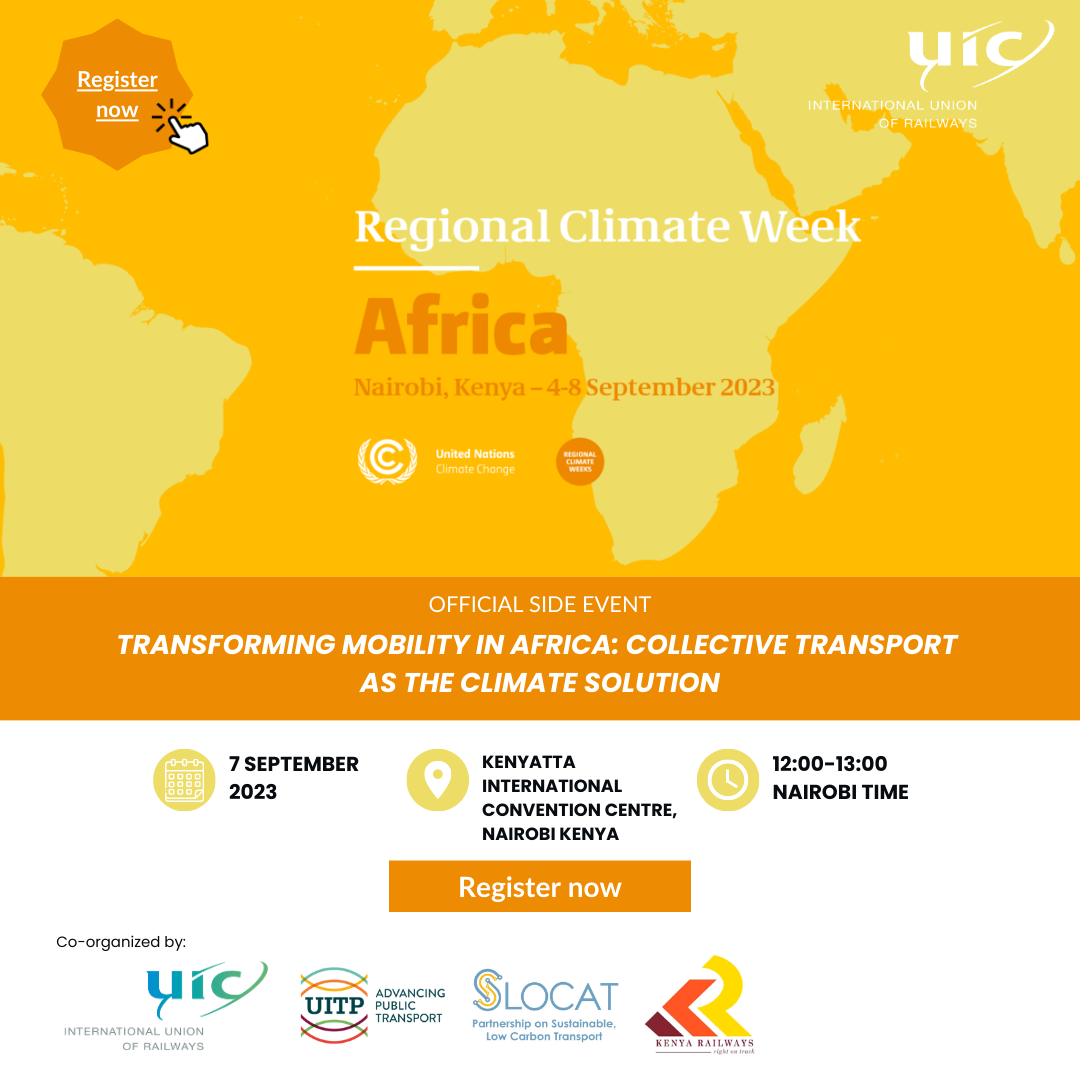 - 7 September: “Transforming Mobility in Africa: Collective Transport as the Climate Solution” Side Event co-organised with UITP and SLOCAT, focusing on the importance of implementing sustainable modes such as walking, cycling, public transport and rail as a solution to the climate crisis, while also discussing the significance of National Determined Contributions (NDCs), capacity building and financing.